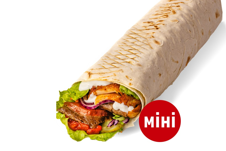 Хрусткий лаваш, соус білий на основі йогурту та з нотками часнику, мікс салату(айсберг,капуста пекінська,капуста синя,морква), помідор, синя цибуля, огірок маринований, куряче м'ясо, теляче м'ясо.