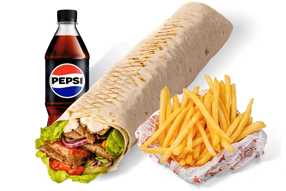 Crispy pita bread, yogurt-based white sauce and cheese sauce, salad mix, cheese mix, tomato, blue onion, pickled cucumber, chicken meat, veal meat, french fries, drink of your choice.