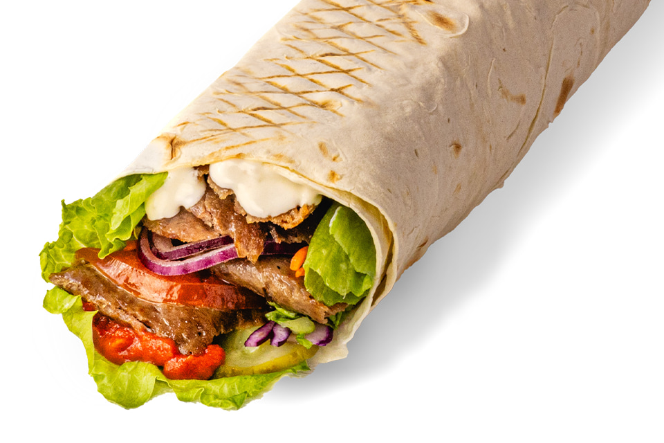 Хрусткий лаваш, соус білий на основі йогурту та соус червоний на основі томатів, мікс салату(айсберг,капуста пекінська,капуста синя,морква), помідор, синя цибуля, огірок маринований, теляче м’ясо.